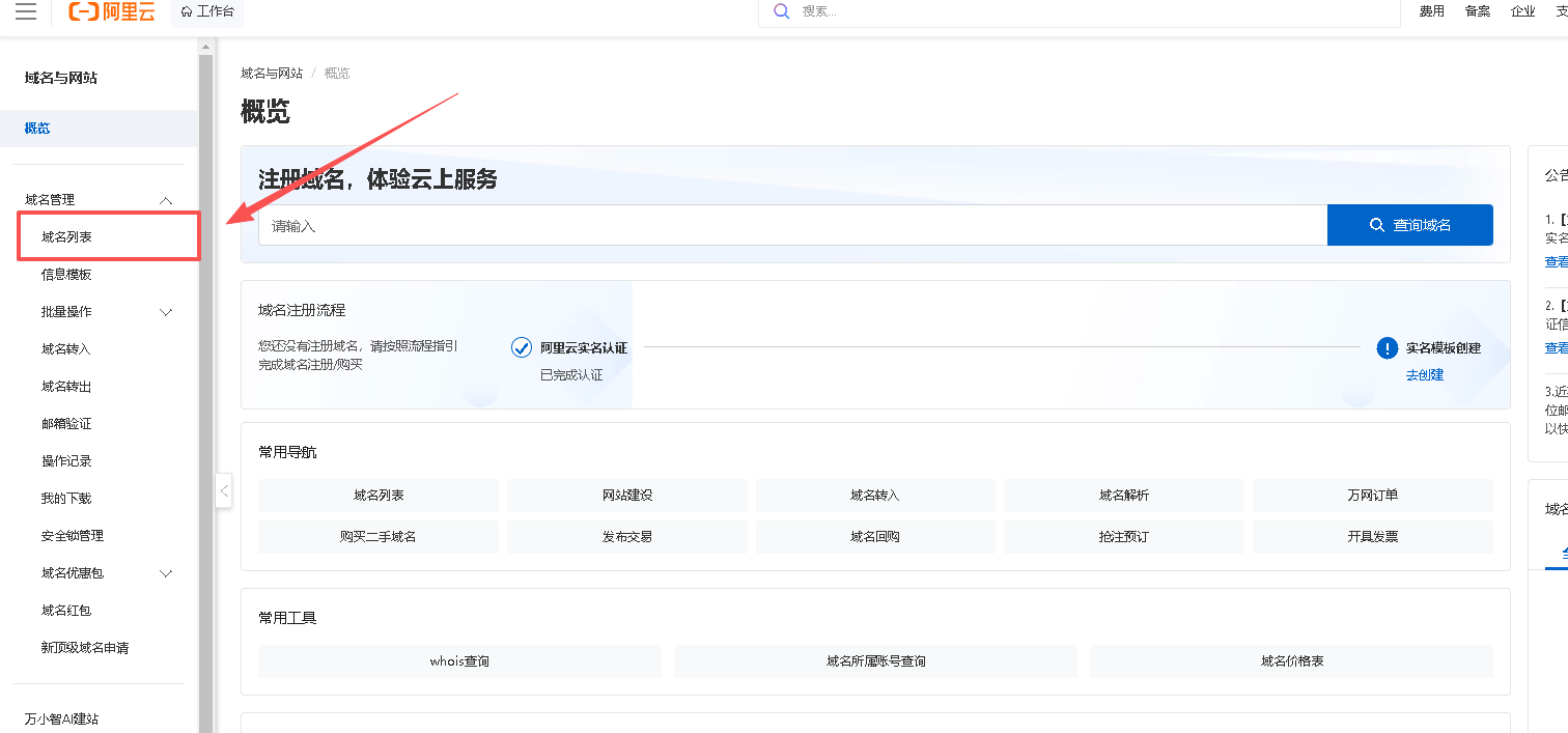 点击左侧导航栏的【域名】,进入【域名列表】。