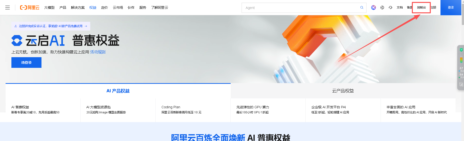 登录阿里云账号后点击【控制台】。